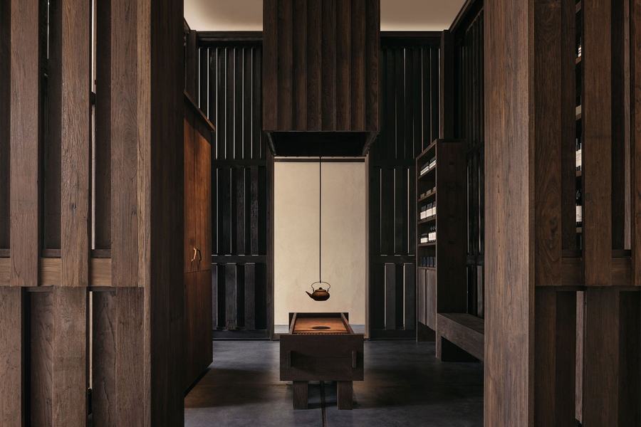 遵循Aesop的原则,用最少的材料达到最大的效果,伊索商店在内部设计上采用了回收的柚木作为主要材料。这些柚木有的来自建筑所有者的个人收藏,有的则来自附近的地区,每一块木材都承载着泰国的历史与文化。背景墙上则是该地区常见的纹理白色石膏,与柚木形成鲜明的对比,既突出了木材的质感,又让整个空间显得更加宽敞明亮。