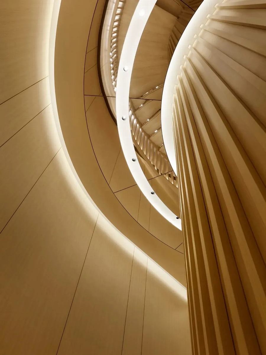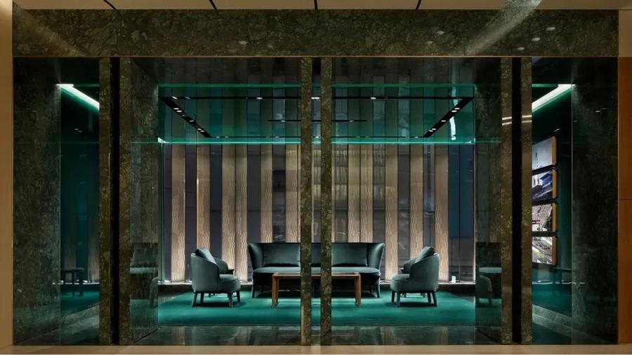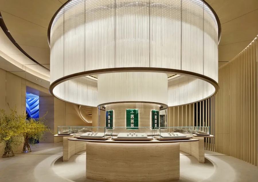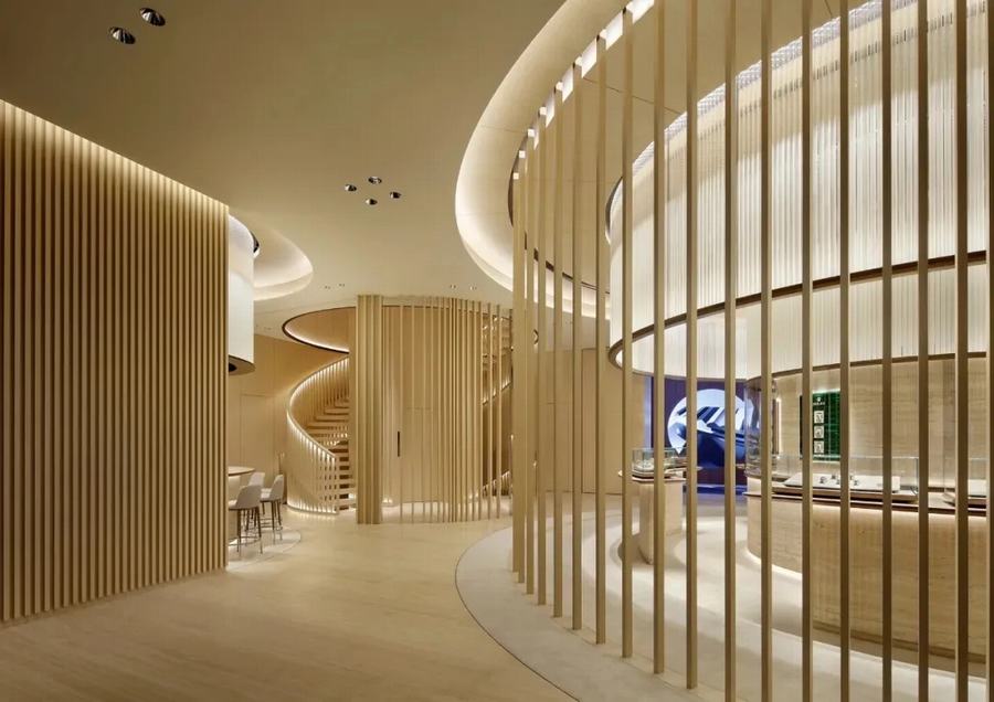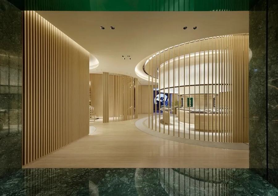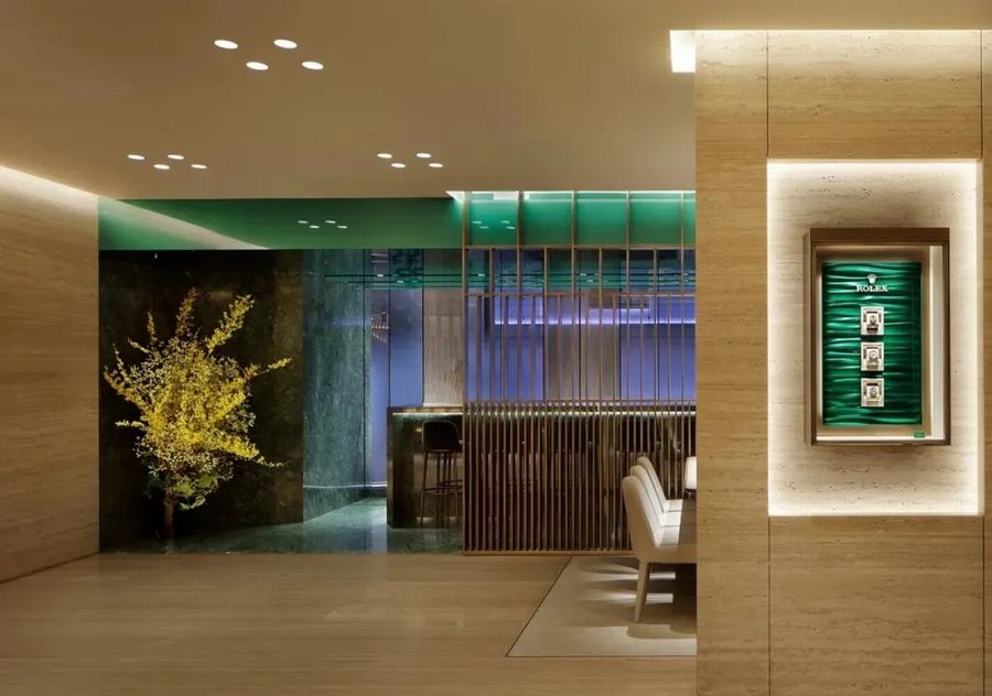 进入旗舰店,一个巨大的绿色石门映入眼帘,它构成了劳力士银座旗舰店的入口,也象征着品牌对精致工艺的执着追求。穿过石门,游客们仿佛置身于一个充满好奇与惊喜的钟表世界。Gwenael Nicolas通过巧妙的设计,将石灰华、森木和磨砂玻璃等材质巧妙地融合在一起,创造出一个精致且分层的氛围。大型双层玻璃元素漂浮在圆形显示器上方,为空间增添了活力与灵动。