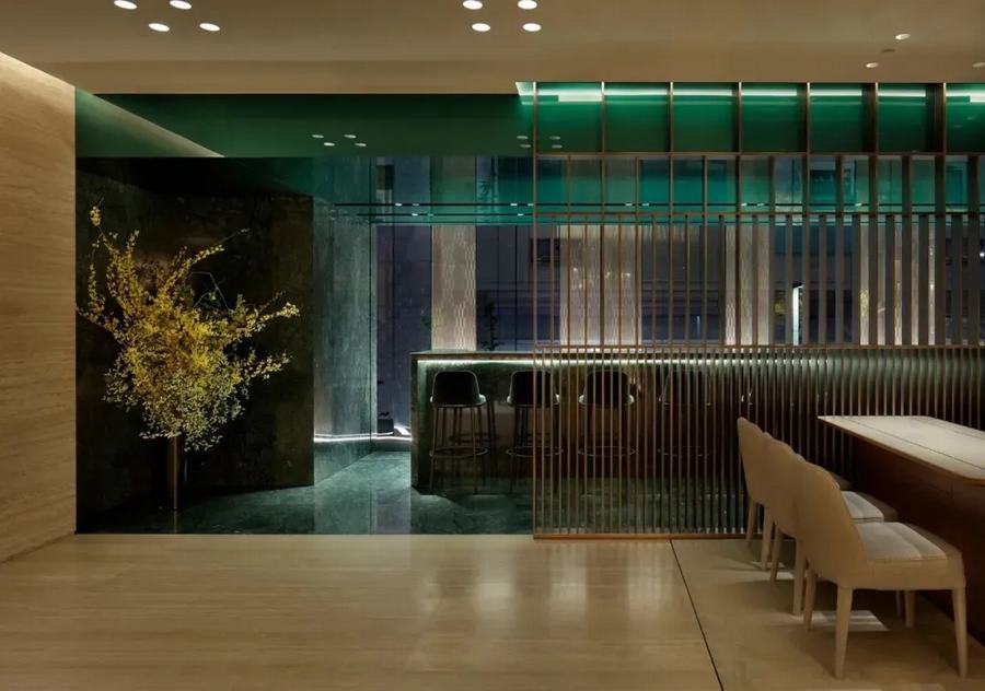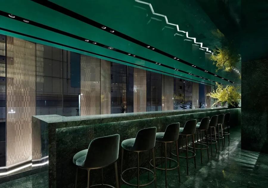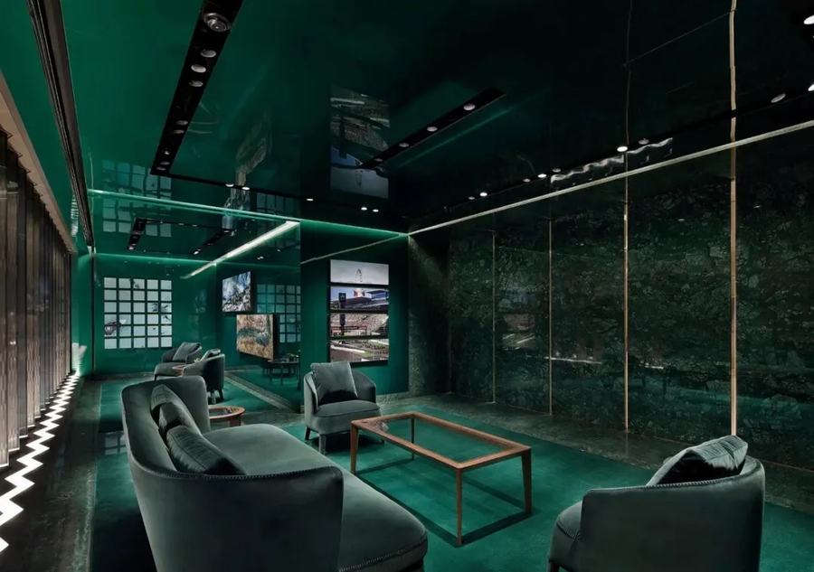 在二楼,一个开放的空间通向一系列沙龙,为游客们提供了一个舒适的交流场所。大吧台区域装饰着标志性的绿色石头和漆,不仅为店内的特殊客人提供了优雅的招待空间,更以其象征性的颜色将品牌的精髓传递到户外,吸引着过往行人的目光。销售区域则延伸到整个旗舰室内,大型石灰华墙壁上雕刻的一系列私人壁龛,为游客们提供了私密的购物体验。