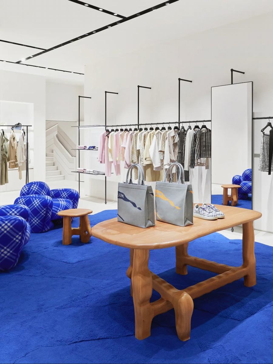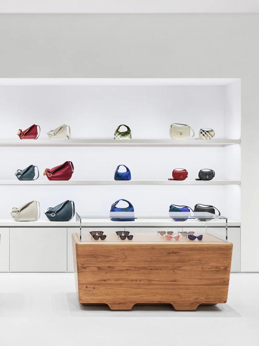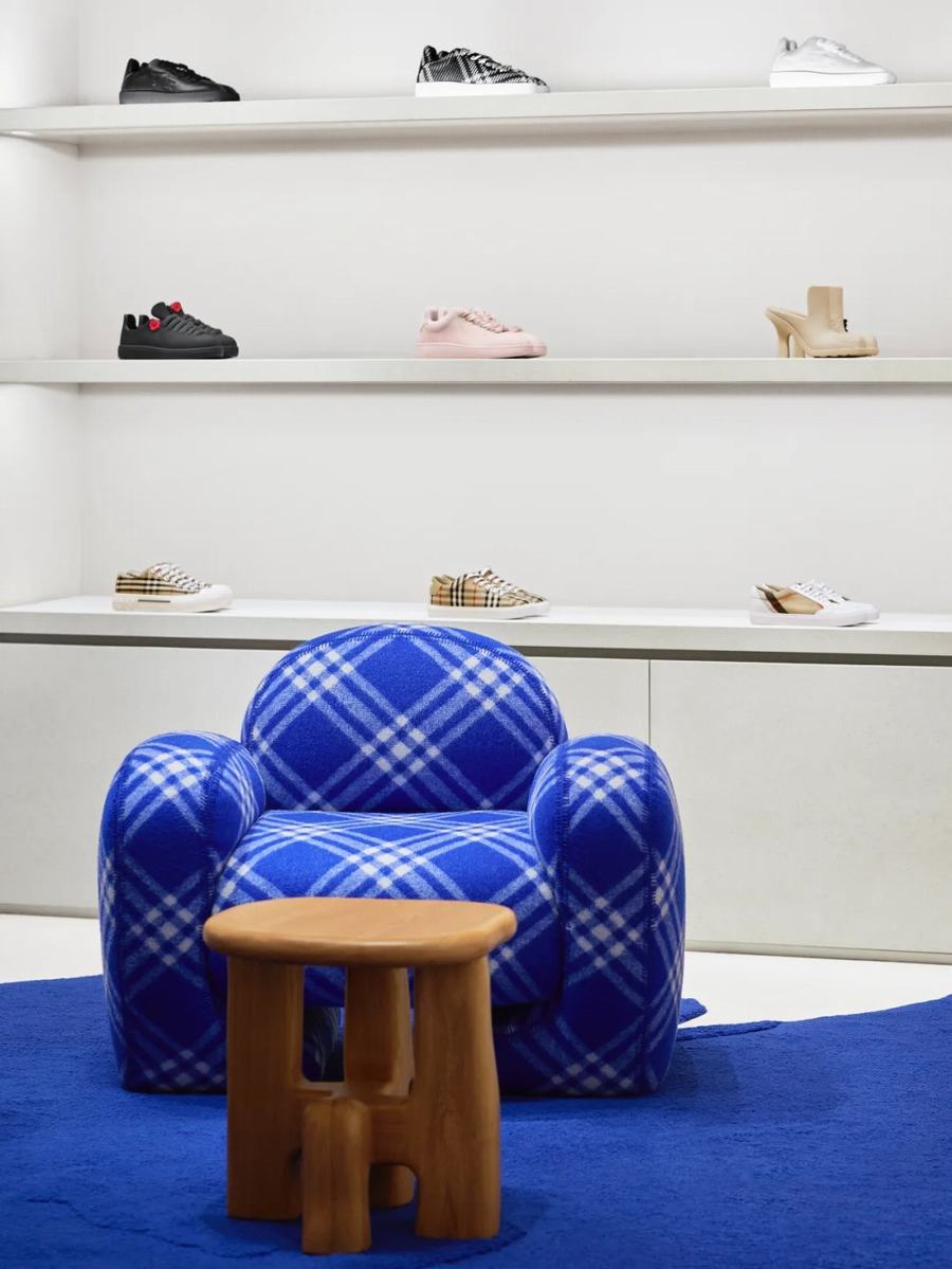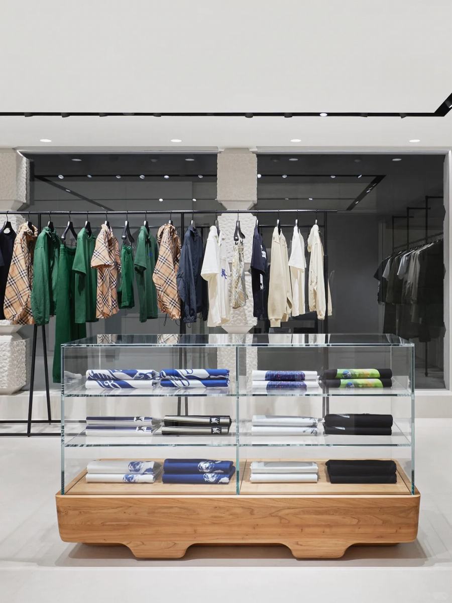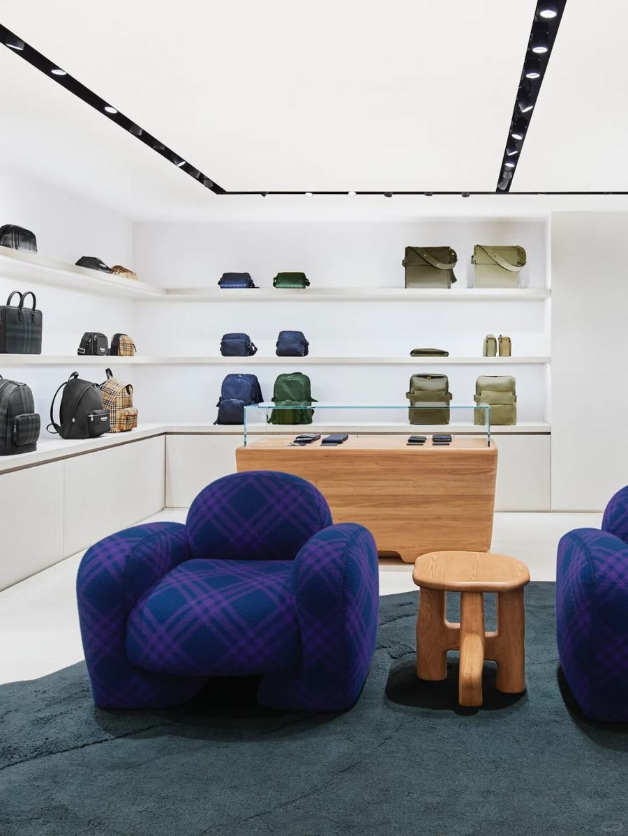 店内装饰更是别具一格,Burberry与多位艺术家携手合作,将品牌的标志性元素及颜色巧妙融入其中。独具创意的木雕陈列桌,以精湛的木雕技艺展现出品牌的独特魅力。骑士蓝绒精美地毯铺满了整个店铺,不仅提升了空间的质感,更呼应了Burberry对独立艺术家的倾情支持。