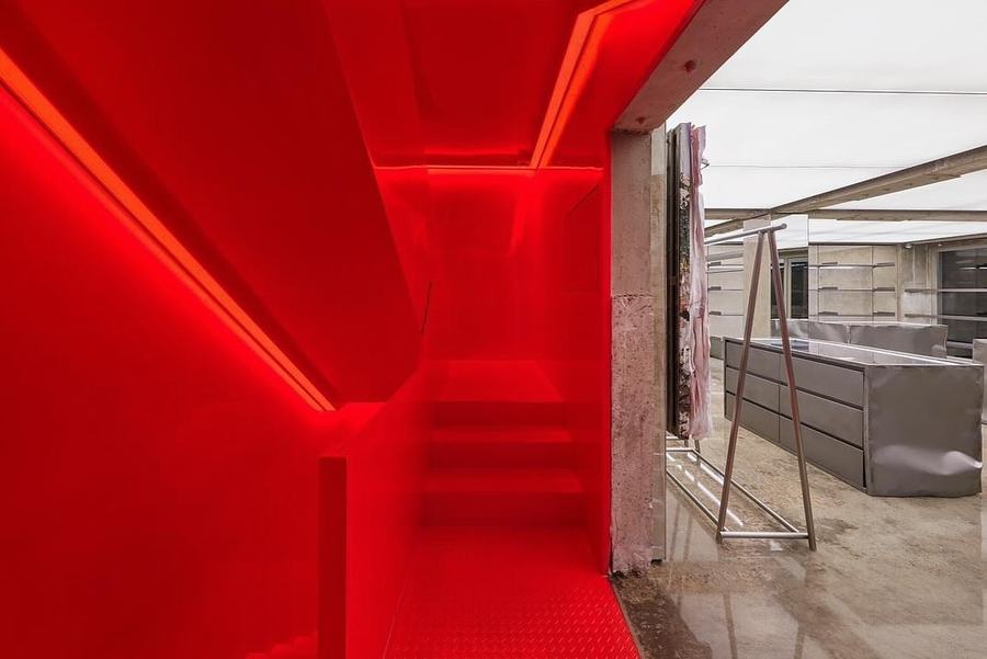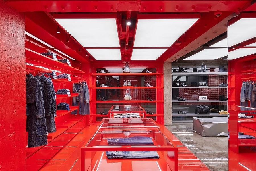 在零售空间内,你可以看到该品牌大胆的红色和工业金属元素,与室内装饰和手工家具相得益彰。一楼是一个大胆的单色空间,展示着该品牌的最新系列。而二楼则被完全用品牌标志性的红色色调包围的墙壁所包围,展示了所有最新的DIESEL女装、男装和配饰系列。这里不仅有最新的设计,还有那些以该品牌标志性的银色为灵感的独家男装和女装成衣,以及该品牌标志性的1DR包。这些产品都是专门为这家店铺设计的,让你可以在这里找到独一无二的时尚选择。