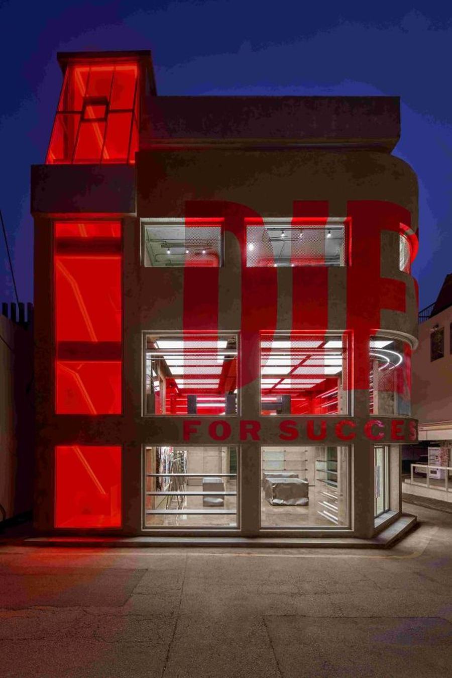 这家新店位于狎鸥亭中心的高档购物区,离岛山公园仅一步之遥。店铺所在的建筑是一座完全重新开发的五层混凝土建筑,正面用粗体的红色字母写着品牌的名字和口号,显得格外醒目。走进店内,你会被这里独特的氛围所吸引。墙壁上覆盖着铆接的原始钢板,仿佛是将道路的原始精神带入了室内。这种设计不仅让人感受到品牌的独特气质,也让人仿佛置身于一个充满创意和活力的时尚空间。