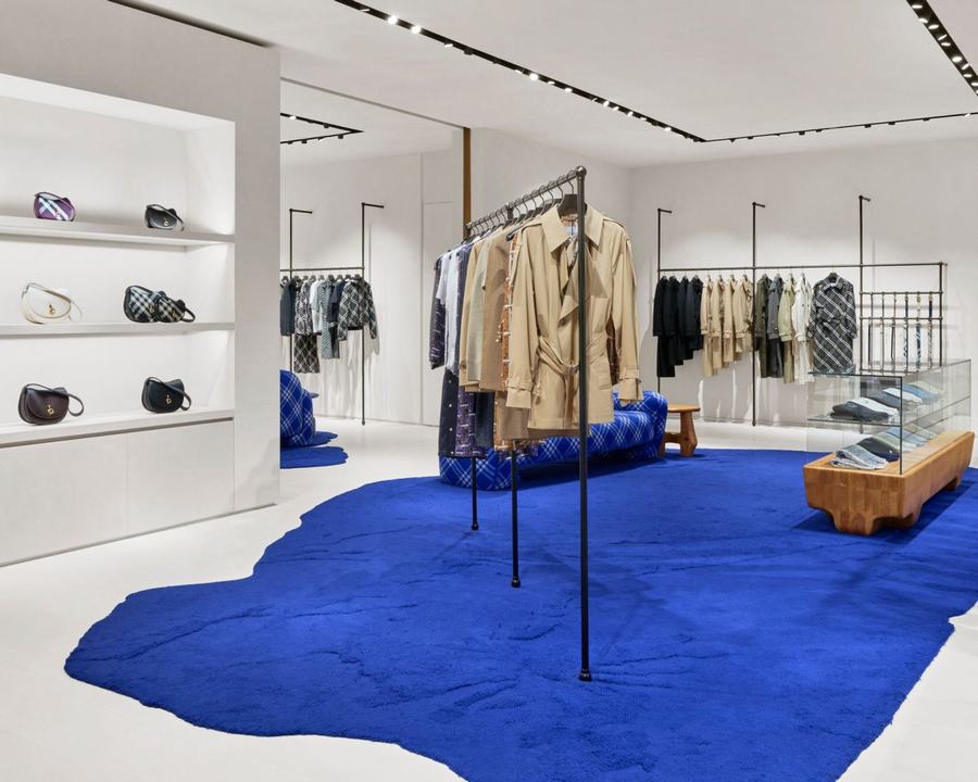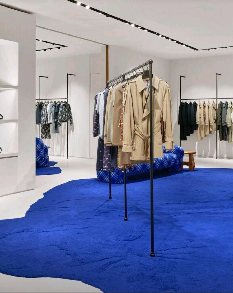 随着脚步的深入,店内每一处细节都透露着精心策划与不凡品味。手工编织的地毯,如同一片片森林的缩影,铺满了通往二楼的楼梯与墙壁,每一步都踏出了自然与奢华的交响曲。这些地毯出自英国纺织艺术家汤姆·阿顿·摩尔(Tom Atton Moore)之手,他以其独特的创意和对色彩的敏锐感知,将巴宝莉标志性的骑士蓝演绎得淋漓尽致,既保留了品牌的经典元素,又赋予了空间新的生命力。流苏边缘的毛茸茸质感,不仅增添了空间的温暖与亲和力,也让人联想到冬日里温暖的阳光和轻柔的风,营造出一种温馨而舒适的购物氛围。