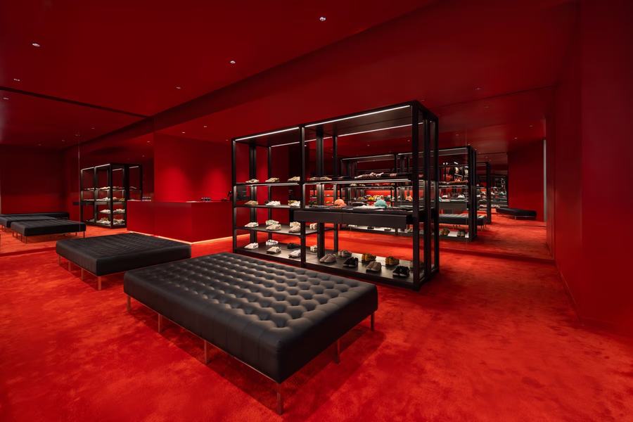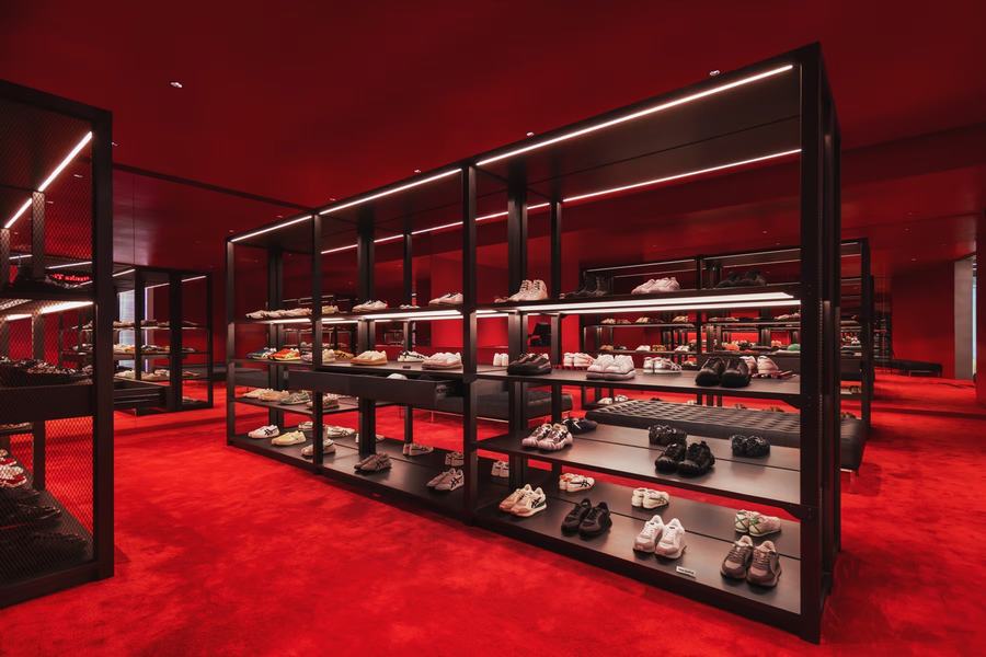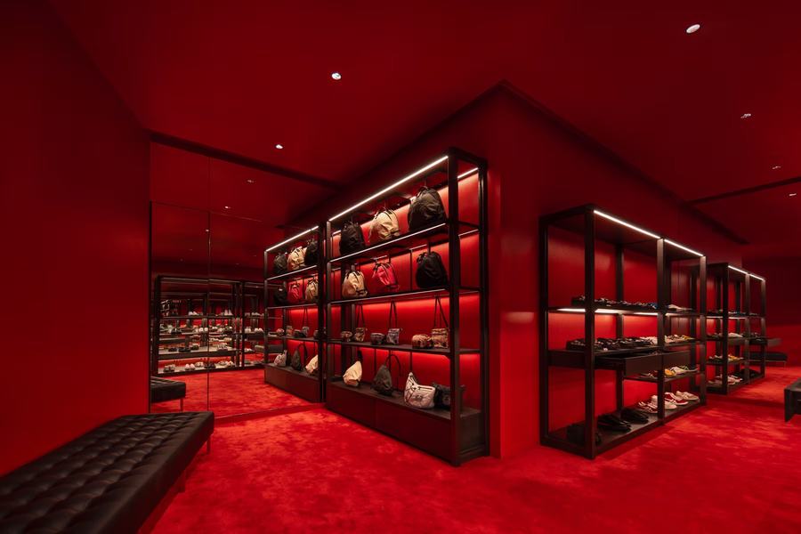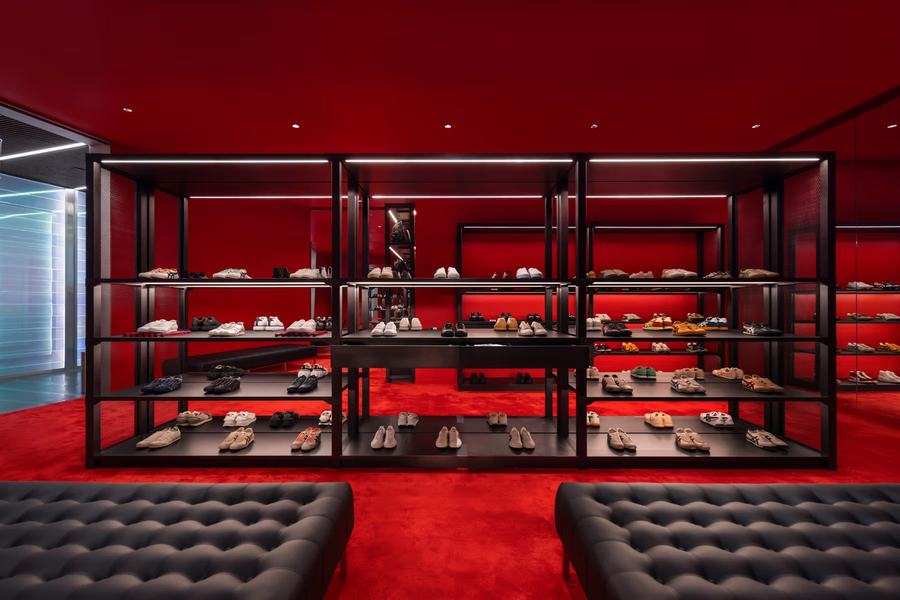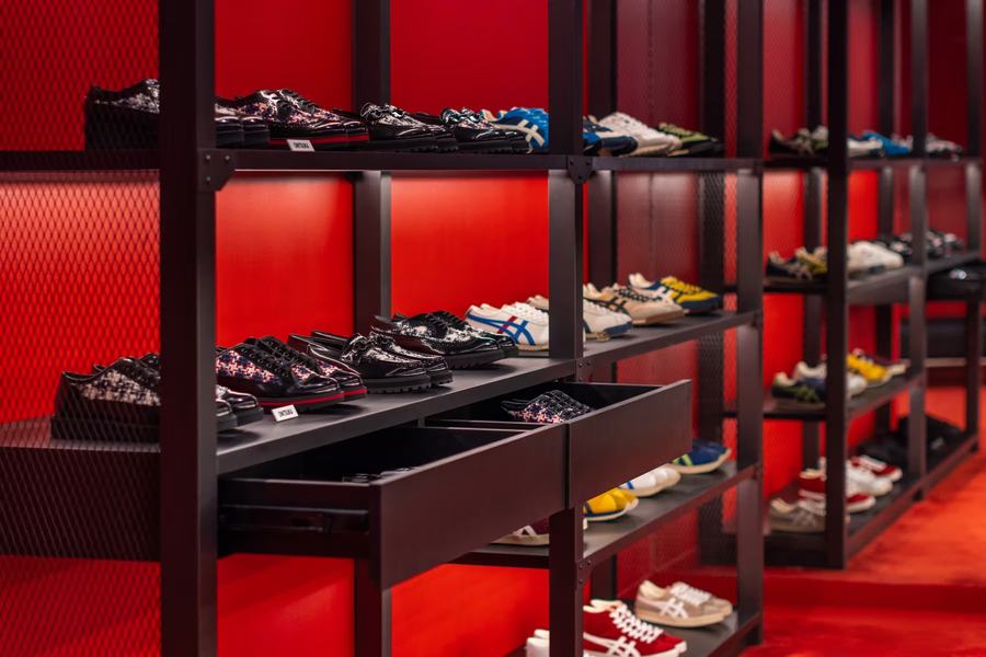 步入店内,一股浓厚的复古与现代交织的气息扑面而来。整个空间以热烈的红色为主调,从墙面到地面,从灯光到装饰,每一处细节都精心布置,营造出一种既复古又前卫的氛围,让人瞬间沉浸在Onitsuka Tiger独有的品牌世界中。红色,这个象征着活力、勇气与激情的颜色,在这里被赋予了新的生命,它不仅是品牌的象征,更是对每一位踏入店内的顾客的热情欢迎。