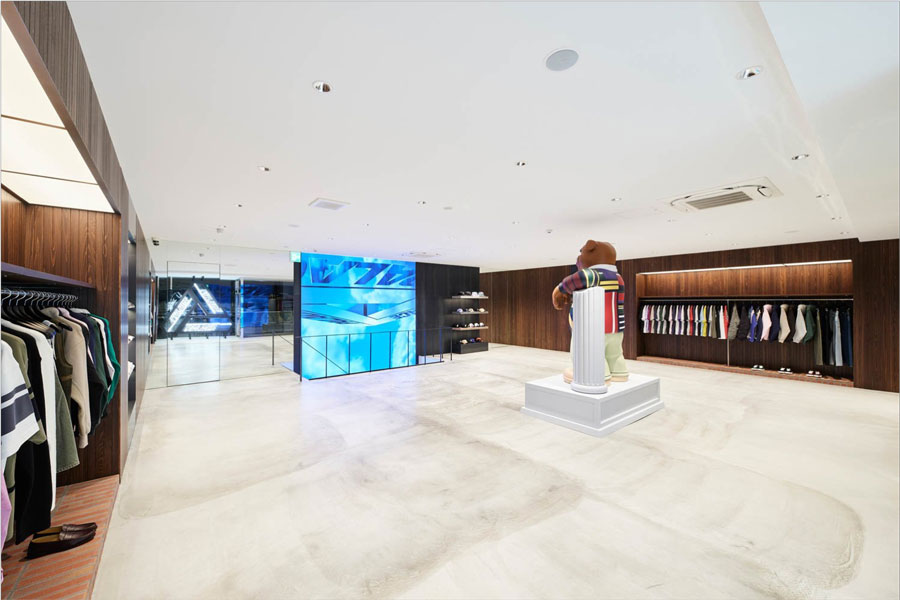 一进店门,最引人注目的就是位于一楼中心的巨大“P”字形混凝土块。这一设计不仅强化了品牌的象征意义,也让整个空间的设计更加具有层次感和个性化。这个混凝土块不仅作为视觉焦点,还作为空间流动的中枢,巧妙地引导顾客从店铺的一侧到另一侧。与之呼应的是店内宽敞整洁的布局,展示空间一侧以木材为主要元素,简洁而温暖,另一侧则覆盖着镜子,视觉上拓宽了空间感。