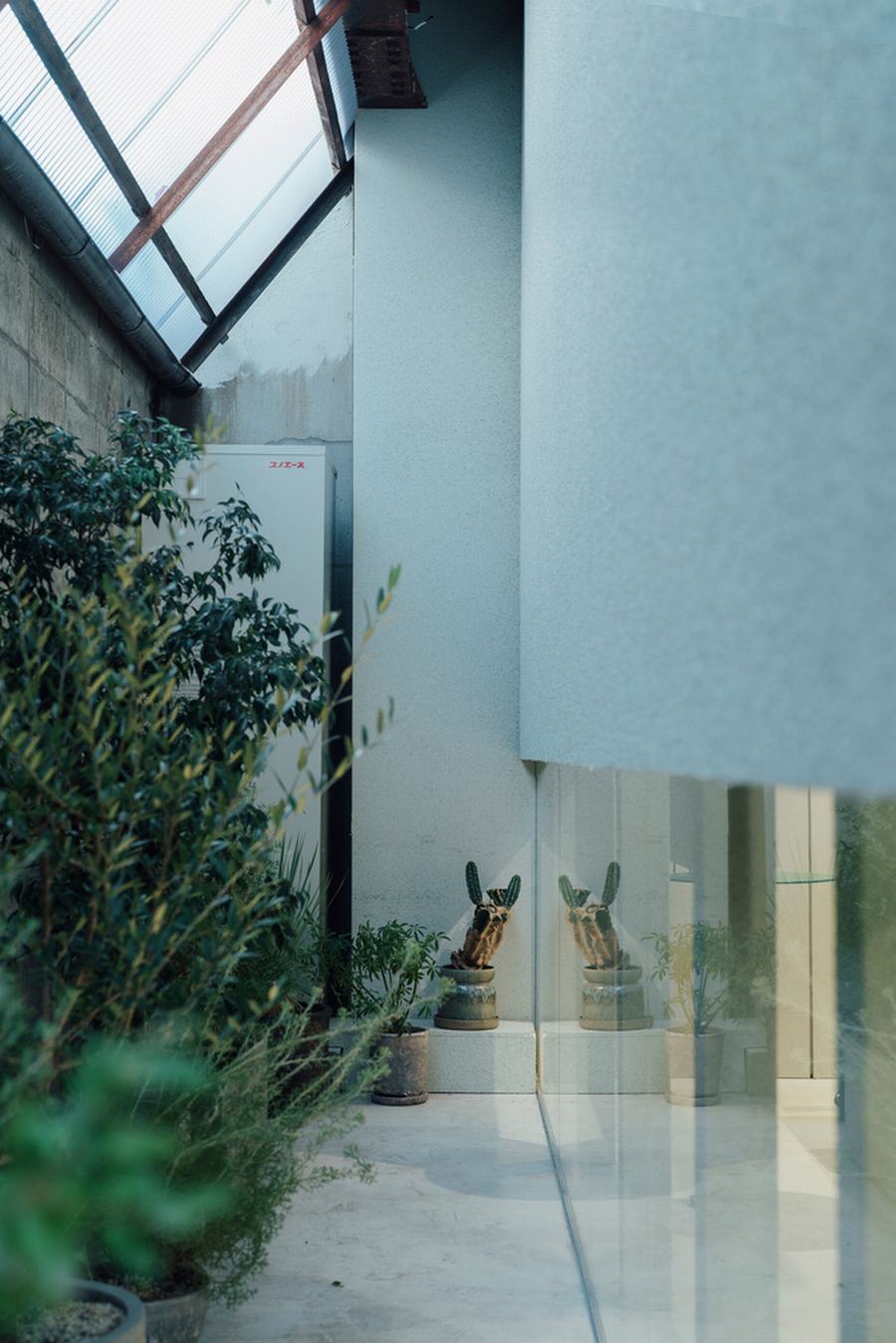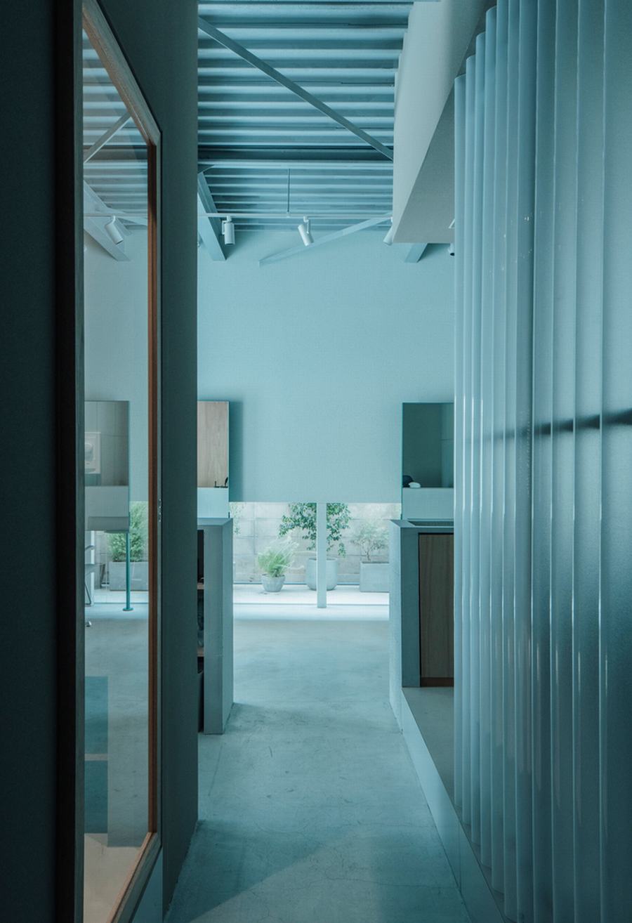 建筑的左侧被保留了混凝土砌块外墙和透明波纹屋顶,这一设计不仅考虑了建筑后部的实用性,还能确保热水器水流的检查和维护。同时,这个公共区域被设计为一个充满绿色植物的阳光房,植物的存在不仅为这个空间带来了生气,也帮助构建了一种内外通透的自然景观,作为沙龙的功能之一,植物成为新旧建筑之间的天然边界,缓解了工业建筑材料带来的生硬感。