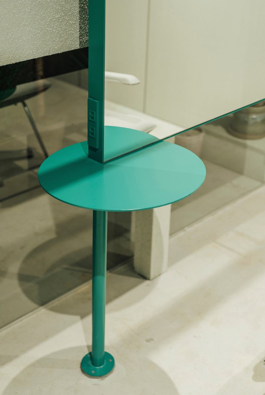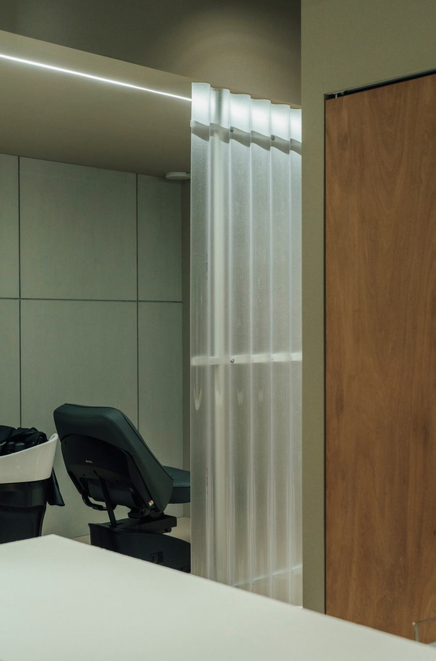 沙龙内的每一处细节都体现了设计师对空间的尊重与理解。比如,所有的功能性设施,如面部支架和镜子,均采用精致的钢材制作,并以单一的绿色烘烤处理,仿佛与阳光房中的植物相互联系。这种材料选择既保证了沙龙的高端感,又避免了过于生硬的现代感,使整个空间与周围的自然环境和谐共处。