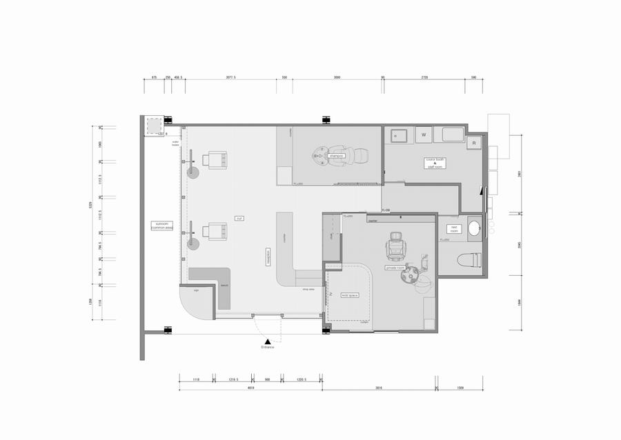 The design goal of Nuru Hair Salon is to transform the tenant space that was originally surrounded by a single wall and had a single purpose into a multi-functional and creative salon. This renovation is not merely the reuse of space, but also a profound reflection on the environment. Before this, the original building’s ground floor had only one wall, dividing the space into multiple independent areas, and the functionality of these areas was not fully developed. However, since both the husband and wife are stylists, they want to create a private and comfortable salon environment in this area.