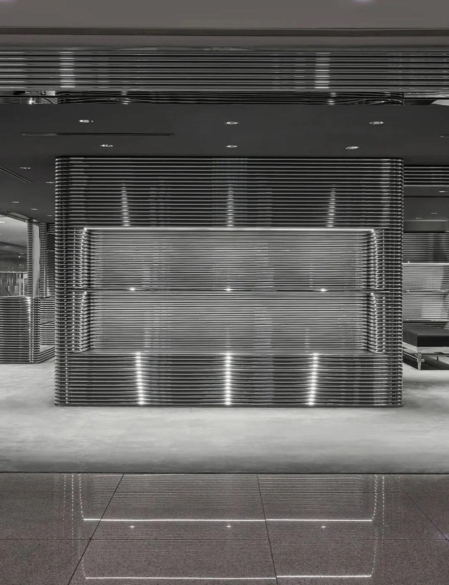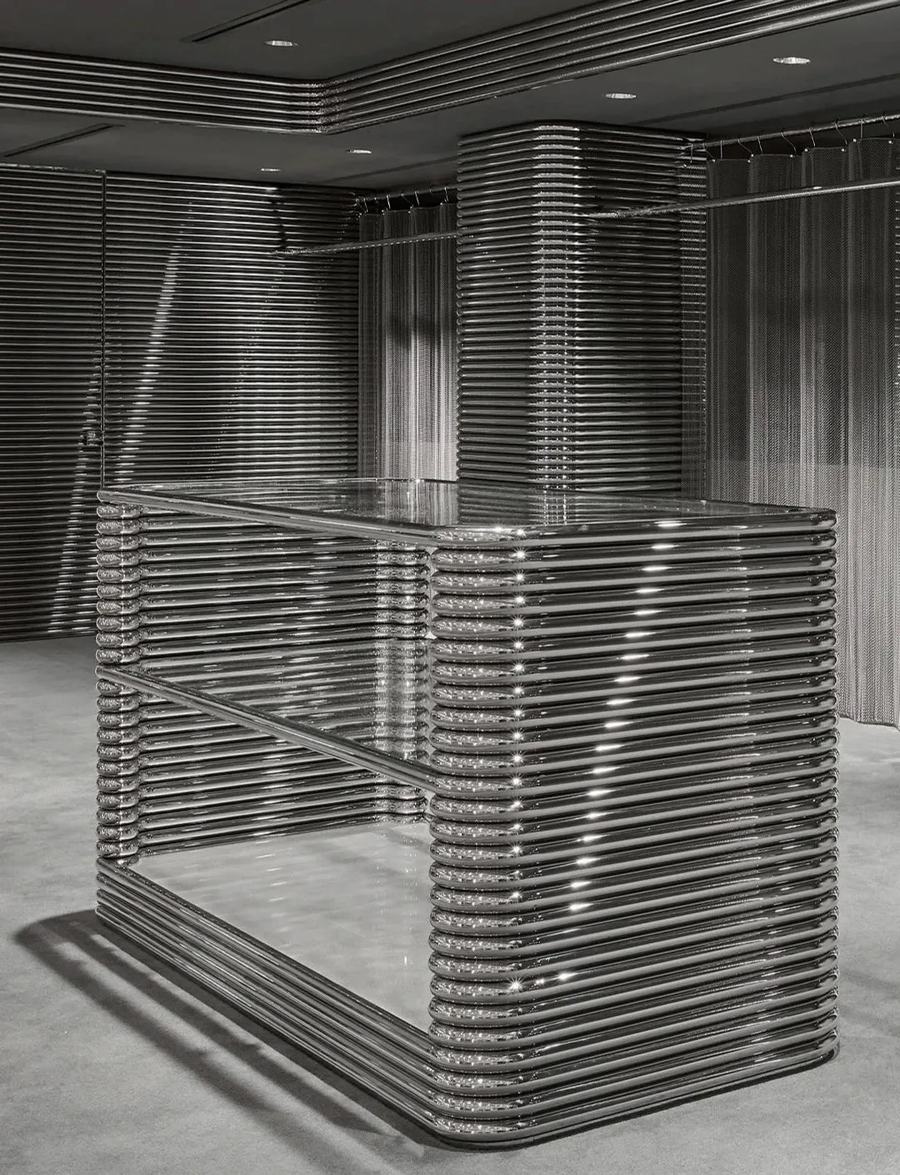 Alexander Wang的新旗舰店在结构上实现了创新突破。空间布局不再是单纯的线性展示,而是通过复杂的层次关系将空间划分为多个感官体验区域。特别是在店内的三大标志性装置中,设计师通过对结构的巧妙运用,增强了空间的视觉张力,并赋予了每个细节独立的生命。流线型的镀铬金属管造型勾画出空间的轮廓,仿佛汽车的线条与力量感融入到每一寸空间。