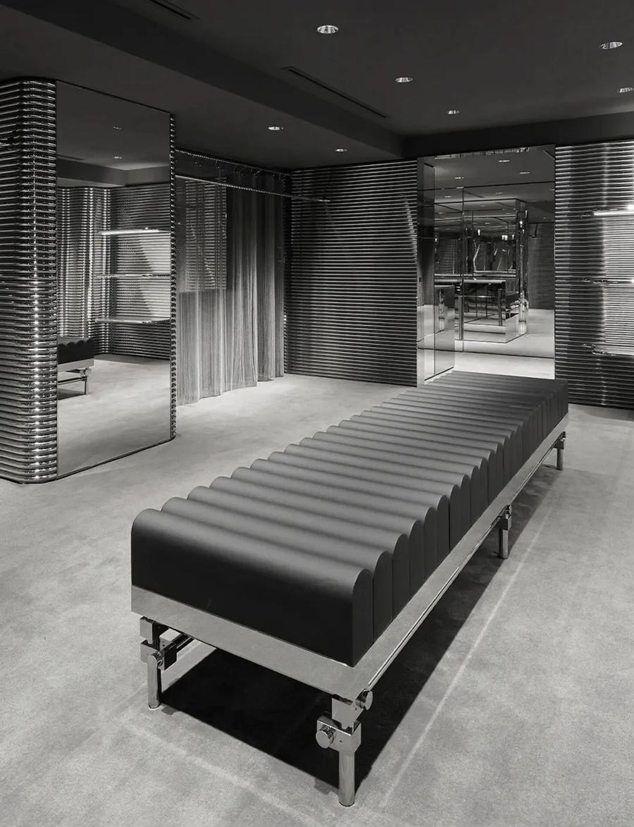 整个店面通过粗糙的金属质感与精致的材料交织,创造了强烈的质感对比。簇状座椅与网眼幕帘的搭配,构建出了一种独特的粗犷与精致的博弈感。在试衣间的镜面折射下,冷冽的光芒与空间本身的工业美学形成了强烈的视觉冲击,进一步强化了设计的现代感。