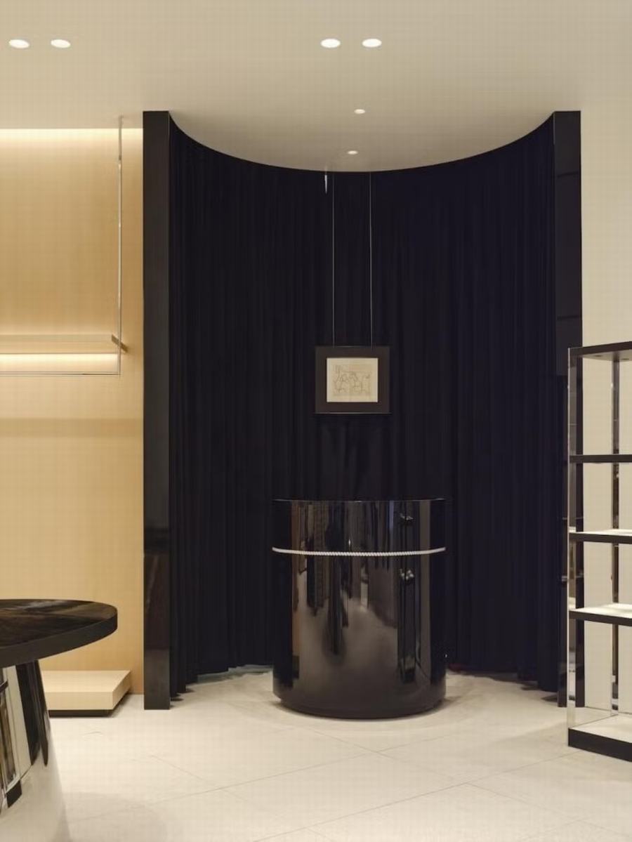 UNICA ATELIER的设计强调了材质之间的巧妙碰撞,尤其是粗粝花岗岩与亮面不锈钢的结合,这种对比既突显了现代感,又保留了经典的艺术气息。通过这些材质的碰撞,品牌传递出“随性与精致”的设计哲学,强调不拘一格却又细腻考究的美学理念。细节处如马毛陈列桌、马缰绳撞色沙发及“马踢腿”支脚等,与墙上的奔腾小马插画、悬浮的图腾锁扣雕塑相呼应,形成了一个富有动感与生命力的空间,使得品牌精神得到了具象化表达。