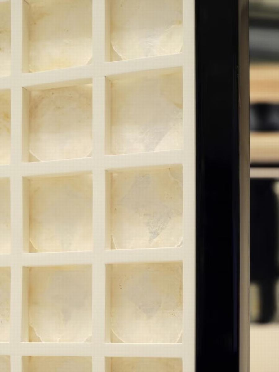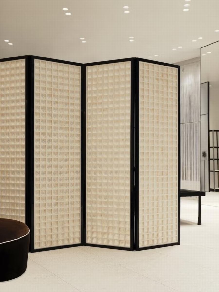 店内的明瓦屏风是设计中的另一大亮点。此屏风灵感源自南京的非遗文化,并精心选用海月贝壳纯手工雕刻,展现出传统匠艺的智慧与美感。每一片贝壳肌理都承载着工匠精神和深厚的文化底蕴,而这一元素在现代设计语境下得到了创新与再生,成为连接历史与未来、东方与西方的艺术载体。