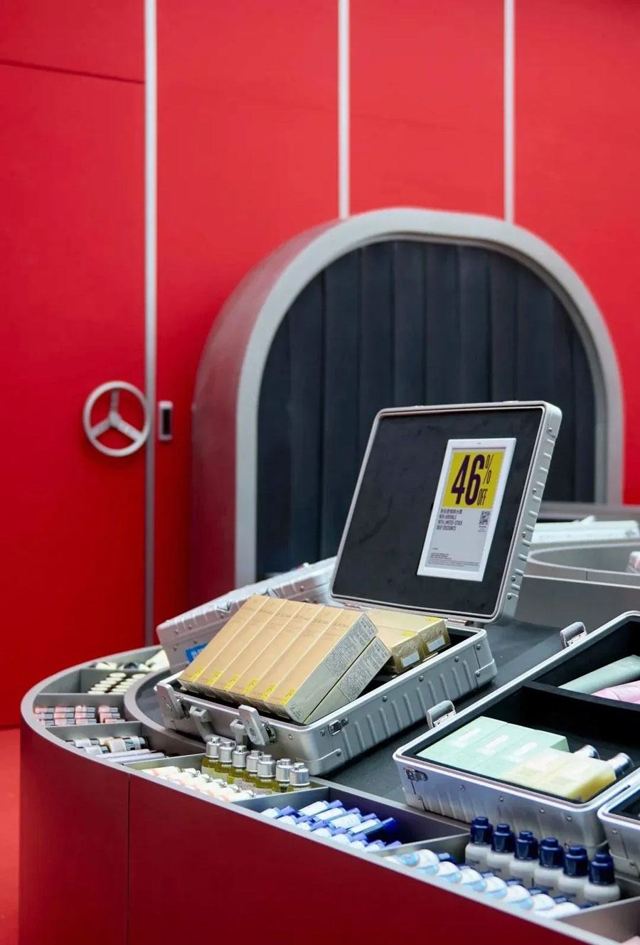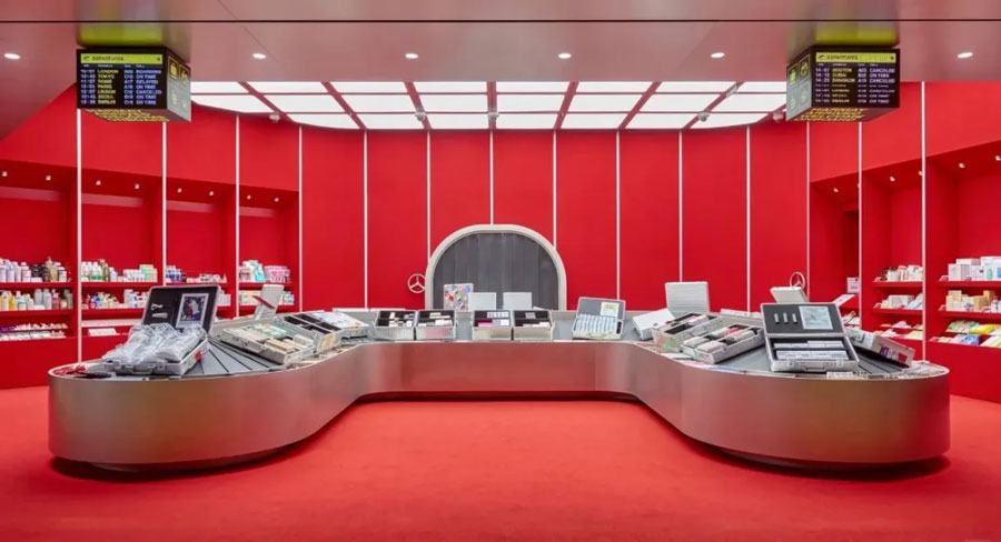 话梅虹桥机场店的设计灵感来源于复古机舱,结合机场的独特氛围,采用了红色布艺墙面和金属货架等元素。中央的动态行李转盘装置成为了整个店面的视觉焦点,与两侧的LED“航班”信息屏相得益彰。