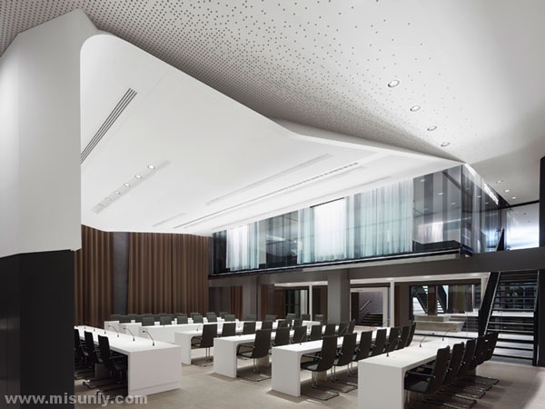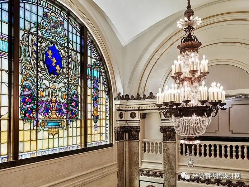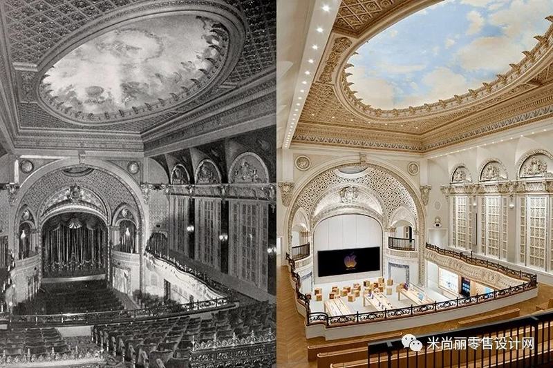 在商店的中心是论坛和签名视频墙。论坛将在苹果店举行,在这里,每天免费的会议为客人提供灵感,同时教授实用技能。宽敞的礼堂,周围是装饰的拱形隔间和修复的青铜装饰,展示着苹果所有的产品。对于支持中心,商店使用了剧院的原始座位,位于上层的酒吧。为了便于使用,安装了两部电梯。