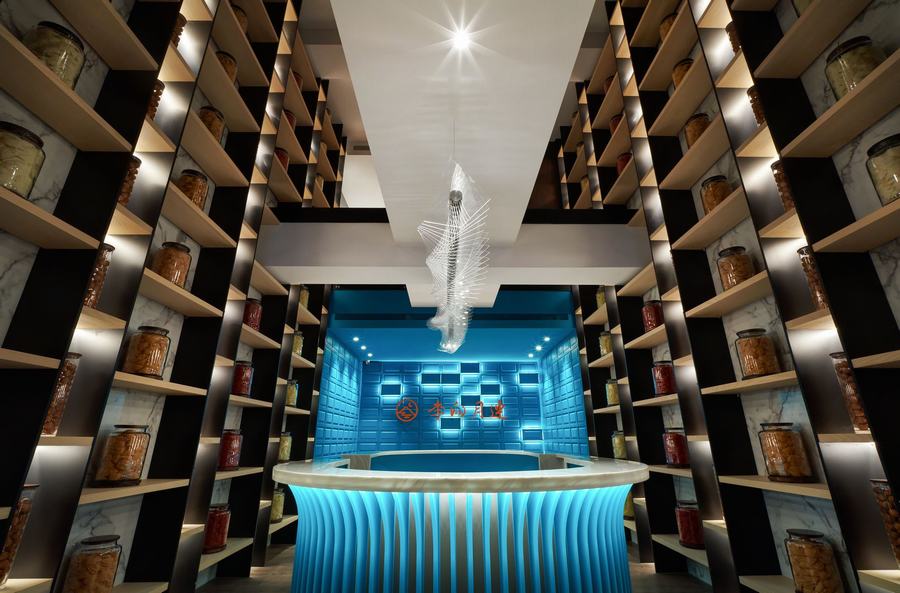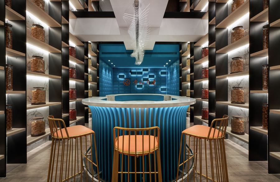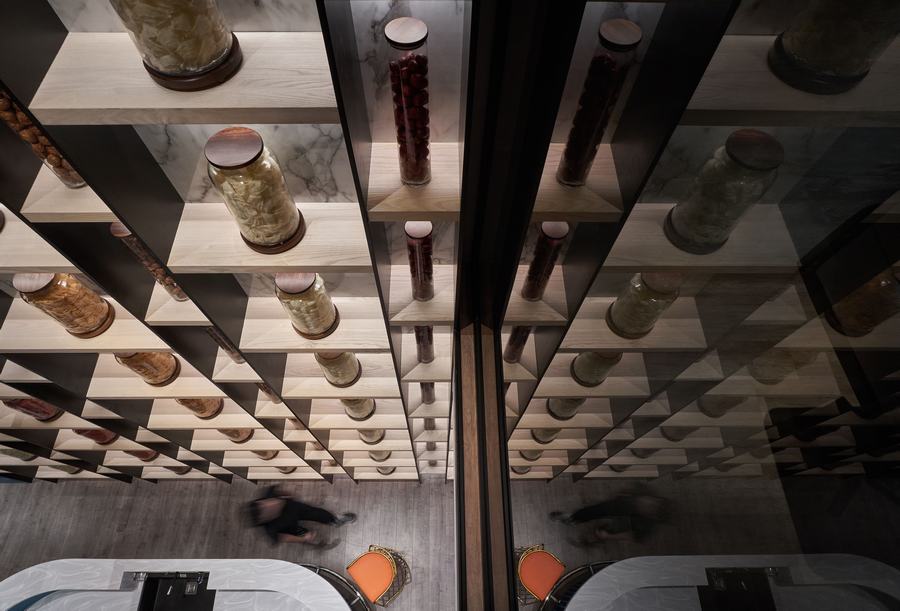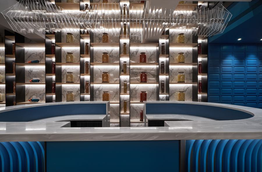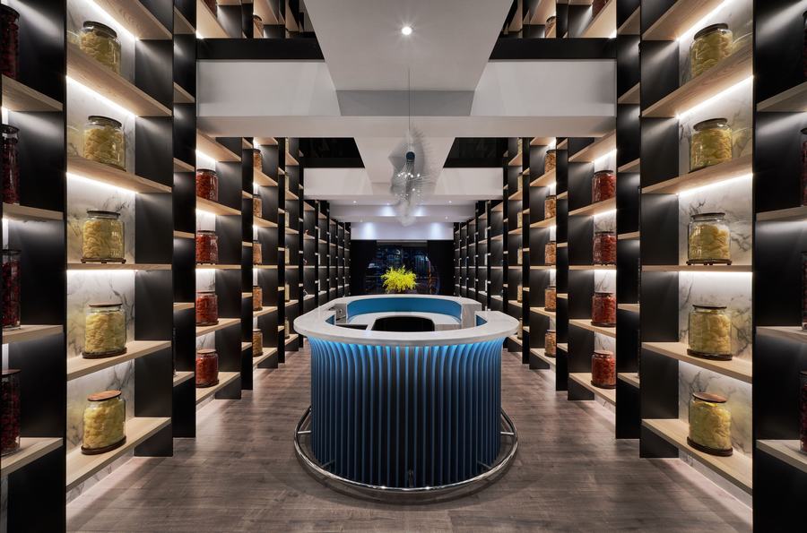 为了体现健康的概念,主墙的设计以中药柜的形象为基础。旁边的橱柜,摆放整齐的食材容器,成为空间中引人注目的装饰。为了促进可持续发展,在装修上采用了大量的环保绿色材料和节能照明系统。