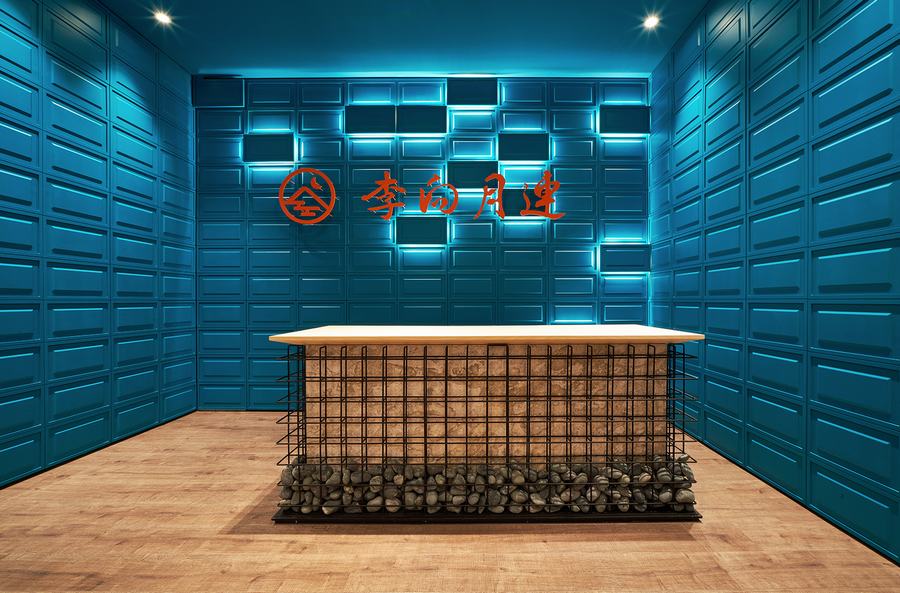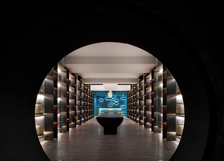 从后面的蓝色墙壁可以看出强烈的视觉设计。蓝色在东方传达着永恒,反映了体验逃离中稳定的力量。入口设计从洞穴中创造了一个乌托邦式的土地,象征着老年人在健康和幸福的道路上。