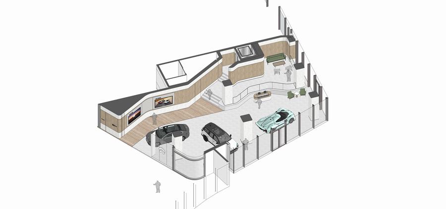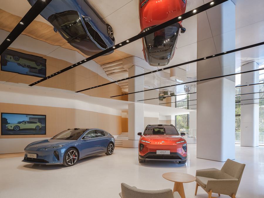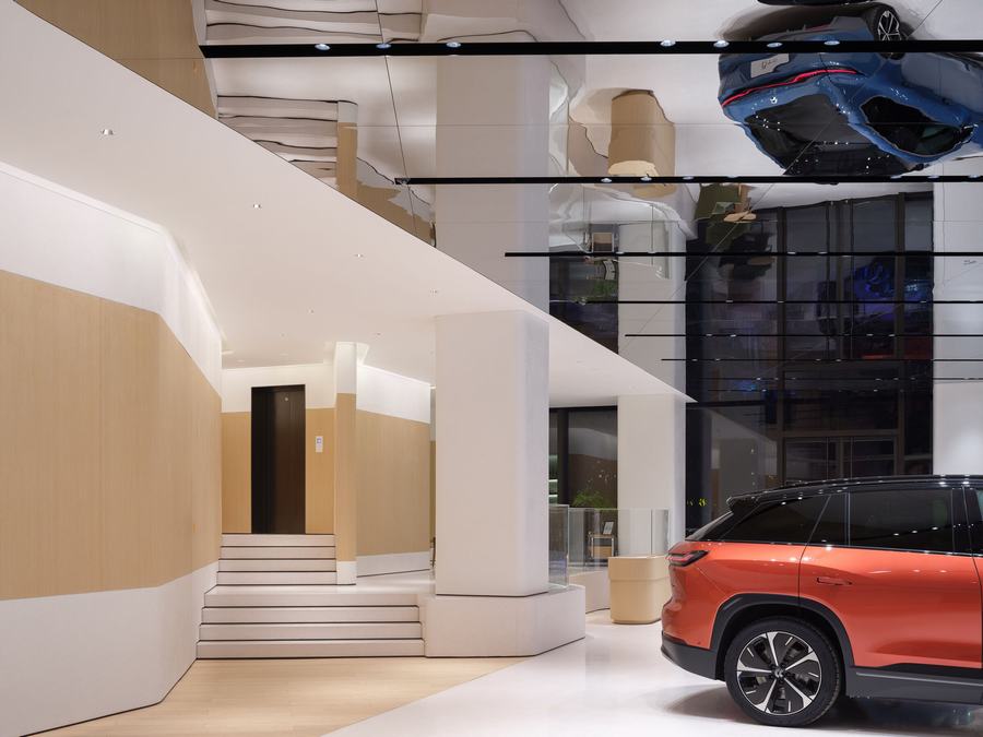 汽车陈列在一楼停车场。这个展厅包含了来自其他蔚来汽车的标志性设计功能,如镜像天花板,邀请游客从一个新的角度看电动汽车。旁边是一个凸起的休息区,用于与潜在客户交谈,配有定制家具,让人想起蔚来汽车的形状。未来蔚来汽车新确立的设计原则是,展厅和休息室之间模糊的边界创造了一个半私人空间,同时提供对汽车本身的不同视角。