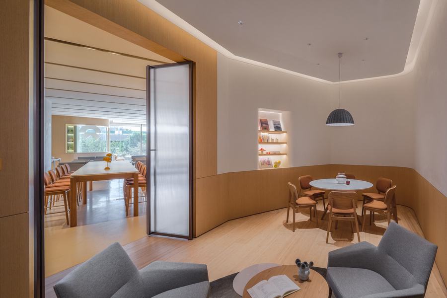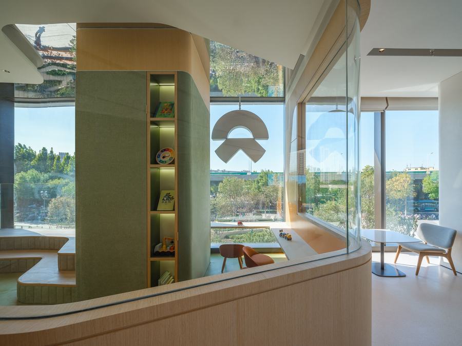在楼上,一楼展厅的动态形状、温暖的材料和开放的空间被转化为一个更家庭的空间,为社区量身定制。这是蔚来汽车专属的私人会员空间,通过二楼指定的入口进入。中心区域包含家庭住宅的核心功能,包括用餐区、厨房和休息室。这是一个视觉上诱人的空间,得益于温暖的触感材料,包括竹地板和天然石膏,柔和的灯光增强了效果,在周围的商场环境中创建一个平静的绿洲。空间经过精心设计,无论客人坐在哪里,都能充分看到他们的视野:在中央餐桌的酒吧凳上,在边缘的模块化沙发上,或在中间的鸡尾酒桌上。除了Kokaistudios的定制家具系统,住宅灵感的设计工具巧妙地展示了NIO广泛的生活方式产品。这包括贯穿整个空间的一组架子,用来展示该品牌的陶瓷、餐具、食物等,更少地作为商品,而更多地作为家居装饰。安静休息室——有效地为用户提供工作、放松或会面的私人空间——也是全球所有NIO住宅的标志性设计元素:本地化。该区域设有一个配有LED灯的壁炉,唤起了中国东北冬季的舒适需求。同样,中央酒吧采用手工制作的当地瓷砖,这是济南闻名的地方。其他封闭的房间位于中央开放式区域之外,包括一个私人聚会空间,以及为蔚来最年轻的用户设计的专用游戏室。通过一个大窗户,父母可以密切关注他们的孩子,视觉连接的乐趣空间通过主要的绿色配色方案和自然材料,保持了NIO住宅独特的冷静美学。