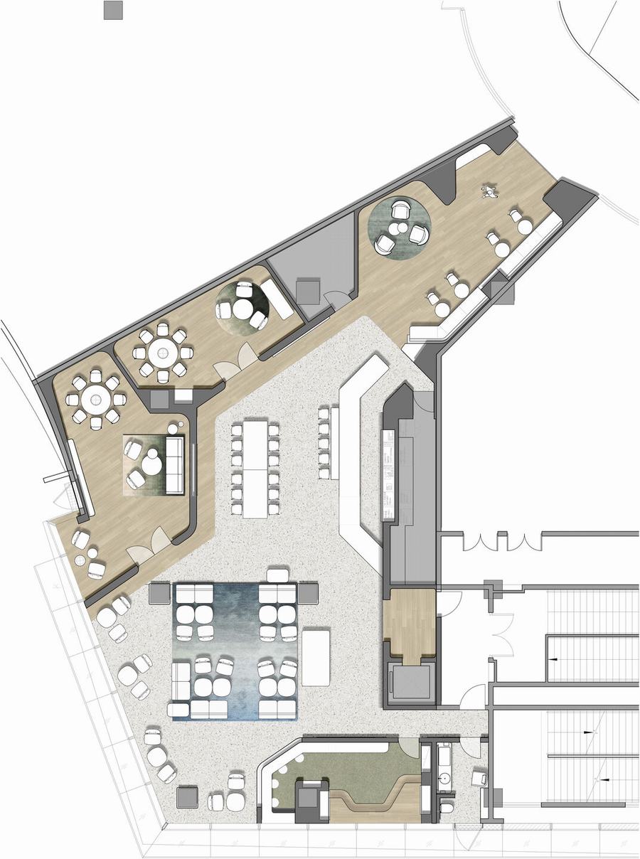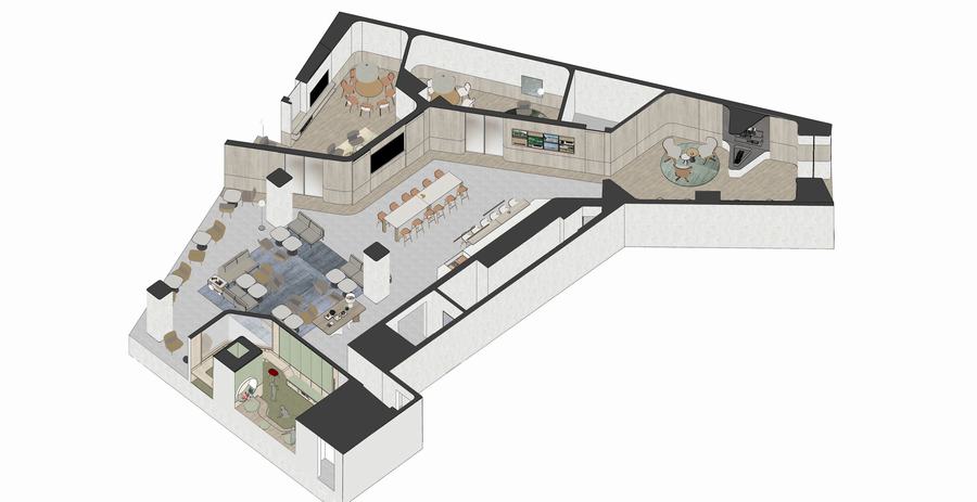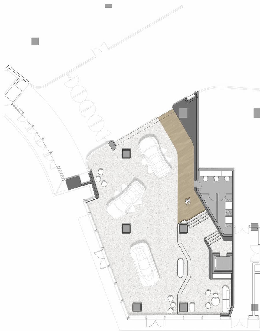 该空间通过材料和展示设备与传统的汽车展厅进一步不同。例如,柱子和墙壁上的天然石膏创造了一种温暖的感觉,也是一种成本效益和可持续的解决方案。设计原则在沿着空间后面的木质路径中得到呼应,这给人一种有机的感觉和运动感,暗示着驾驶和旅行。交互式办公桌取代了明显的商业展示区域,展示可定制的组件,如轮子和充电器,它提供了一种更专属的方式,将规范和展示的过程转变为一种仪式般的体验。同样创新的是一个展示推车,它可以在空间中移动,里面装有室内装饰和油漆成品的样品,供顾客浏览。