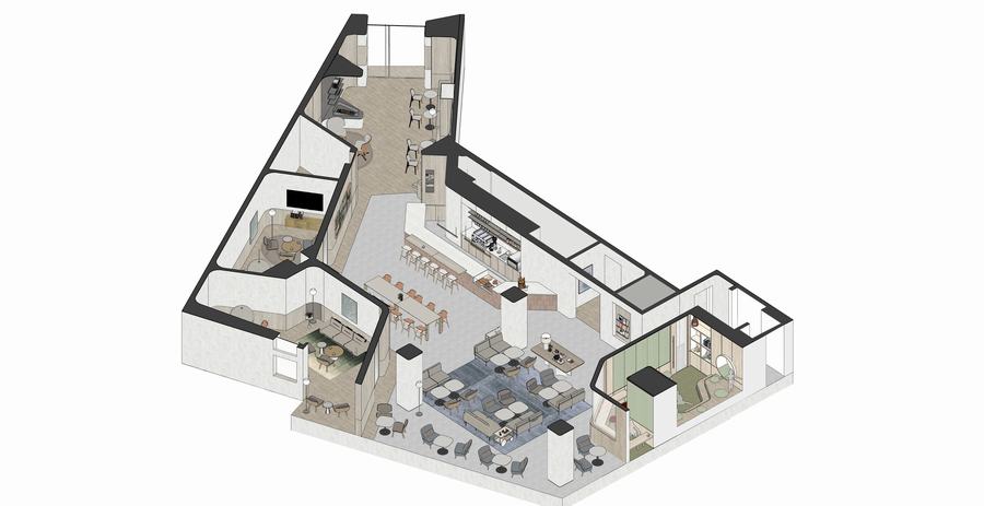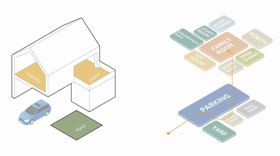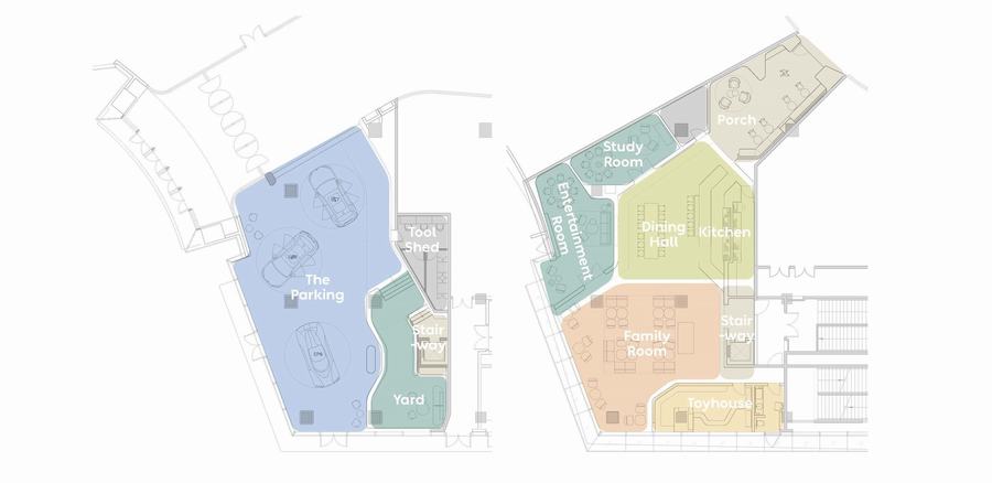Kokaistudios的地标性建筑NIO House位于济南华山uni公园的一个顶级两层转角单元,靠近购物中心的主入口,从街道上可以看到很高的能见度。新开放的“开放之家”的设计理念,为了向不同的用户群提供多种功能,场地的灵感来自典型的家庭住宅。面向公众的一层被想象成一个停车场和院子;楼上是娱乐和学习空间、餐厅和厨房区、家庭娱乐室和游乐区。