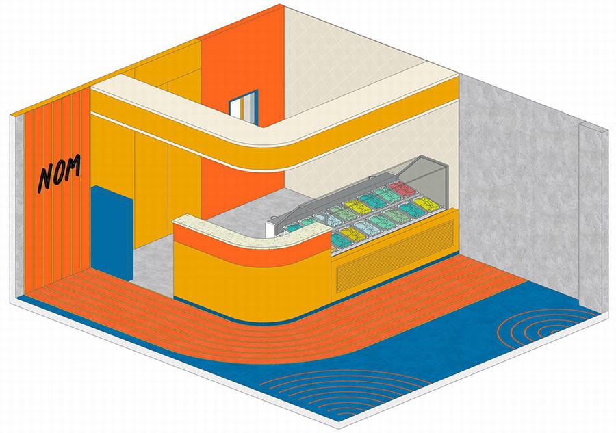 商店的中心将其流动性延伸到地板上,就像夏天融化的冰淇淋一样。从业主的另一项激情——运动中汲取灵感,“熔体”从彩色墙壁一直延伸到相邻的混凝土。它生动的连续性暗示着一场对口味幻想的竞赛,吸引好奇的路人偷看一天的营业时间。以华夫格风格的图案完成,创造了从混凝土到颜色的完美过渡,并作为干燥厨房的实用方法。