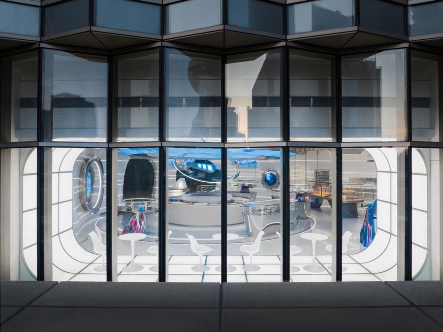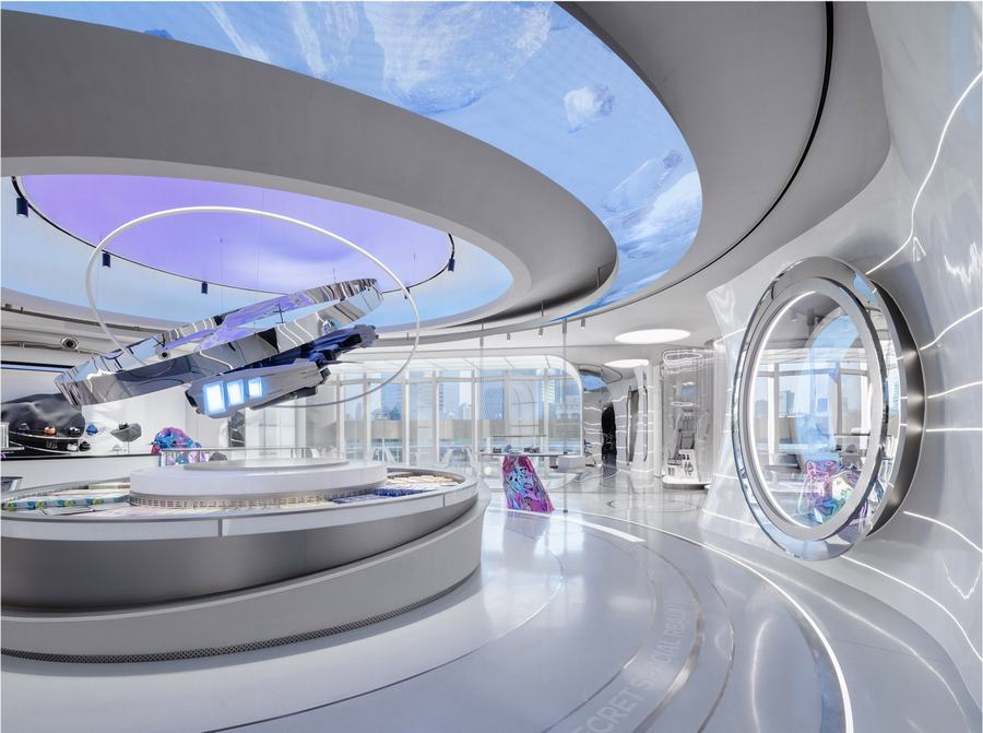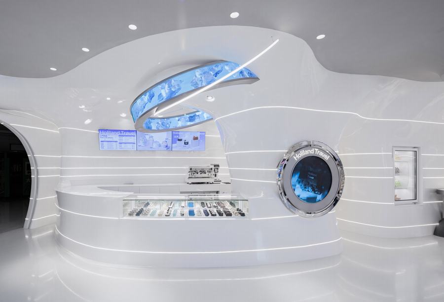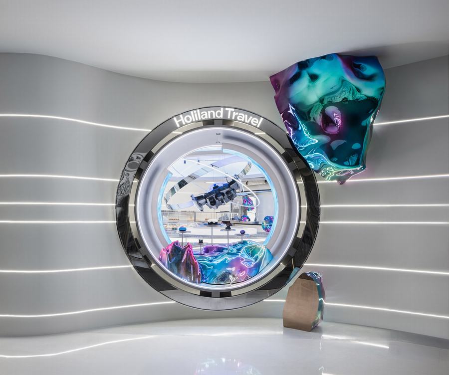 坐在返航舱内,飞机停靠在超空间的秘密领域,弯曲的镜面反射环境让乘客看到三维空间之外的另一个扭曲时空中的另一个自归。从返回舱入口观察点到返回舱的一系列体验场景,构成了模态数字空间与真实场景空间的融合,实现了跨媒体表达。用户的停留、拍照等构成了叠加而复杂的购物情境,为荷里兰宇宙观的具体化传播提供了更多的可能性。旅行者在秘密领域留下足迹,从虫洞返回地球,期待着下一次旅程的相遇。