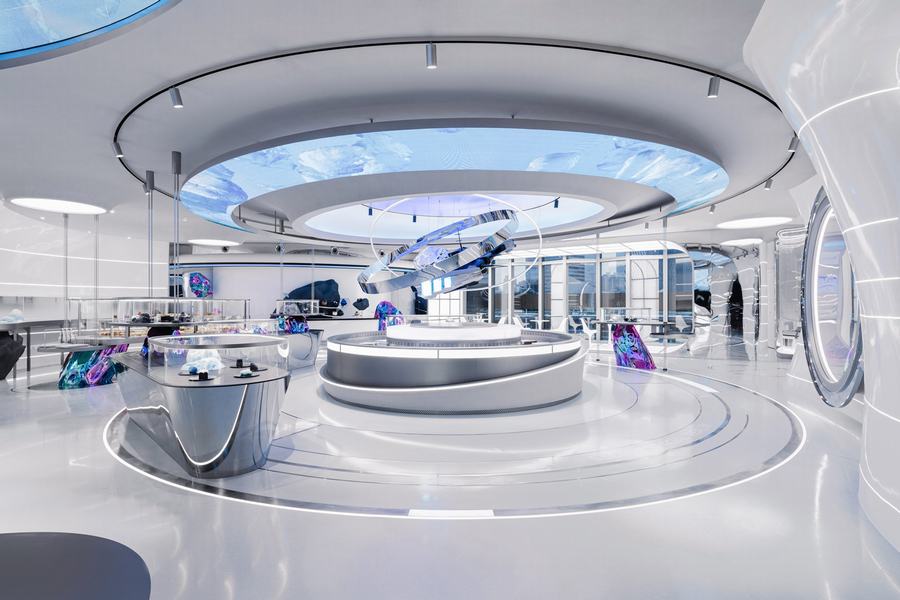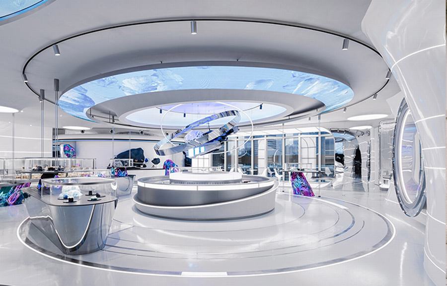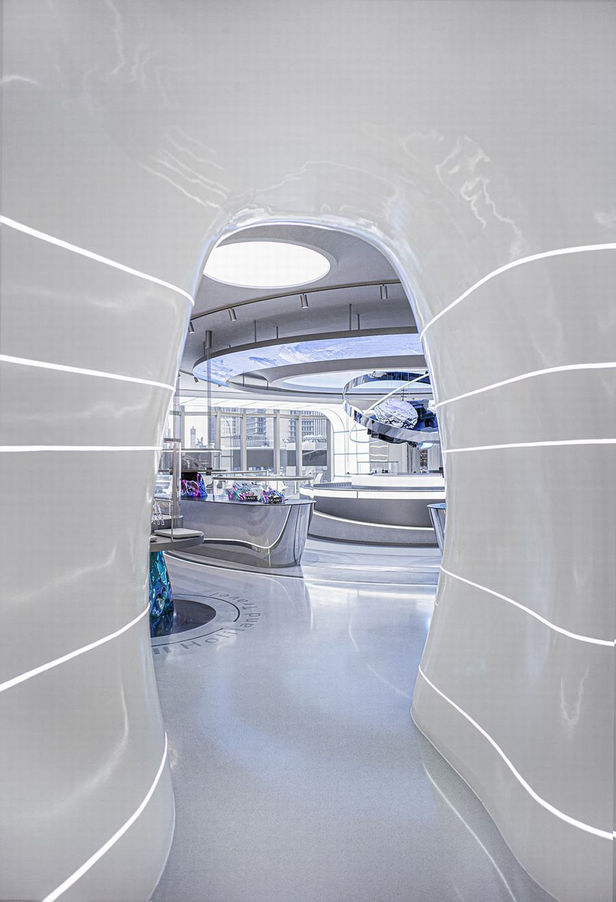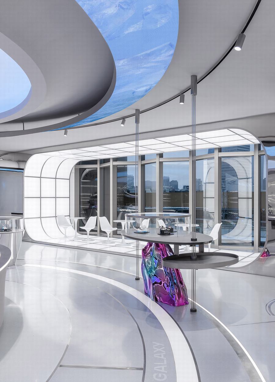 多元宇宙的时空“裂缝”在现实世界中闪现,空间的扭曲导致对时间的感知不均匀。线性光带的无限延伸解释了强虫洞的宇宙引力。通过室外的观景窗,我们可以看到不同时空的场景片段,将人拉入行走在多元宇宙的想象中。身体在地球上,心已进入球体。