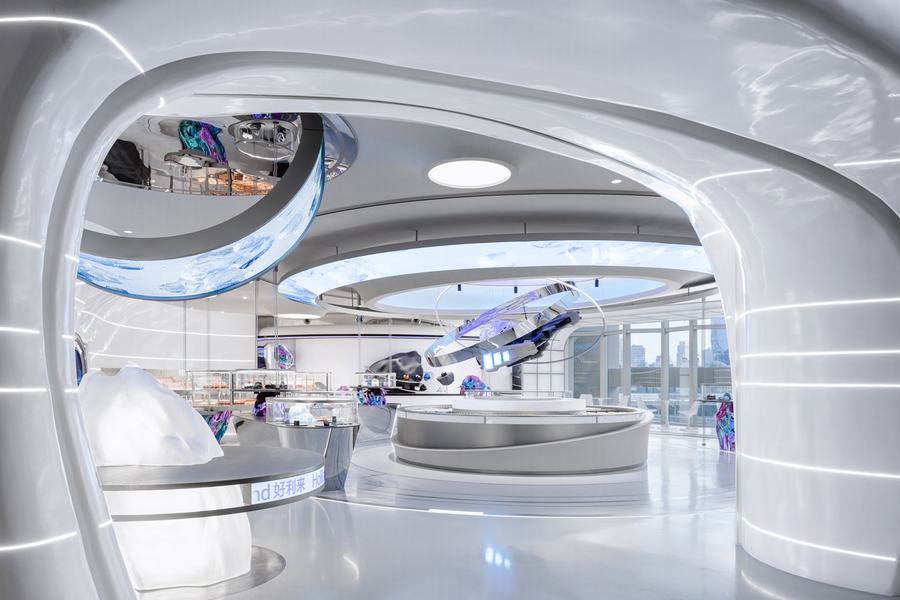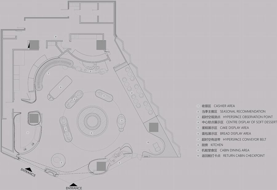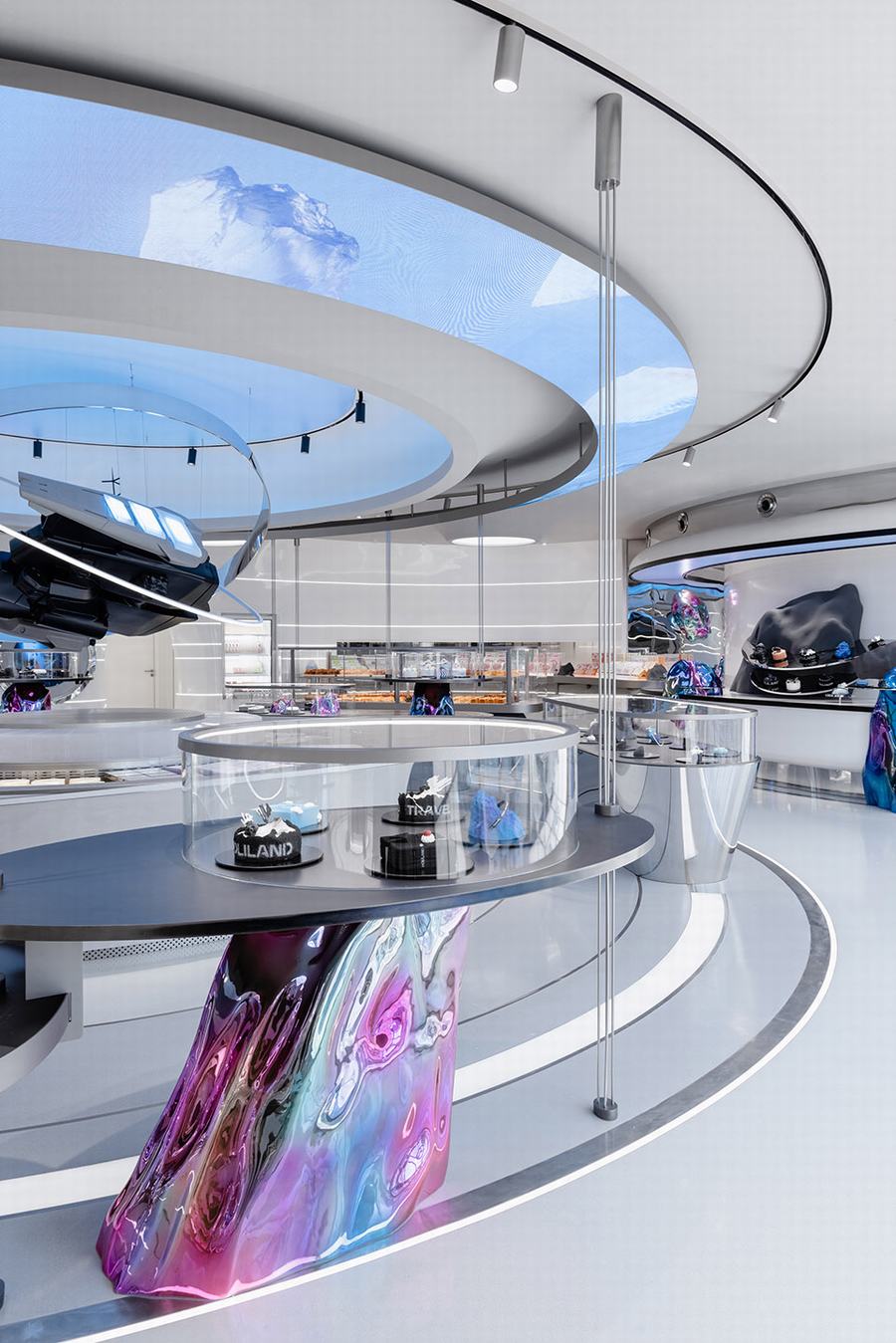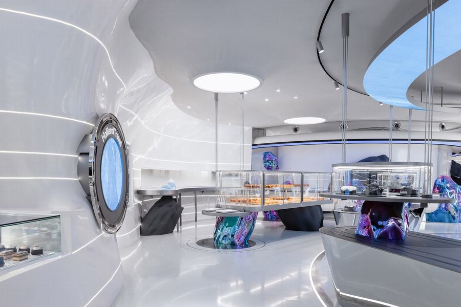 在时空飞船的中转站,可以看到外来物体入侵并撞击飞船。悬浮在黑洞轨道上的小岛,镶嵌着由不同材料组成的入侵陨石,成为甜点、蛋糕、吐司等一系列产品的展示装置,创造了一个悬浮在零重力下的甜蜜失重天堂。在地面坐标轴上做标记,记录异物入侵的位置痕迹。超空间传送带是一种收集和运输物质的设备。它通过时空通道捕捉来自不同时代的外来入侵物,并以三维的形式呈现给乘客。时空旅行者可以选择在传送带上收集不同形式的材料,见证Holiland的超太空甜料供应。
