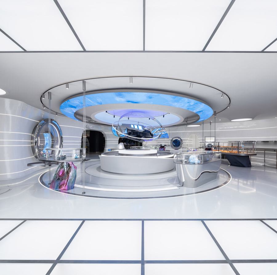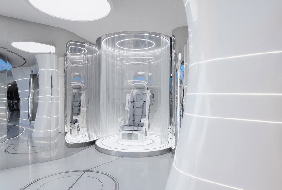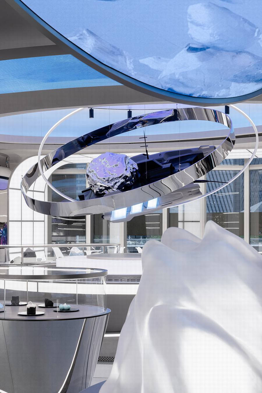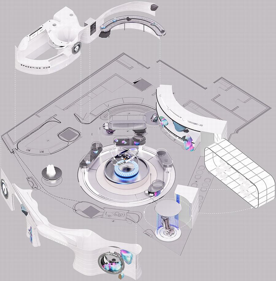从心理入口到实际物理入口,中心陨石坑是连接多元宇宙和地球的唯一“黑洞”,是时空旅行中引力最大的场。在这里,宇宙中的一切,从大到感觉不到,缩小到人们可以理解的规模。时空旅行者站在上帝的视角中,凝视着多元宇宙。该陨石坑可以运输飞机和陨石,以提供来自其他维度的能量。显示外来陨石入侵的圆形LED屏幕、可编程的光梯度动力学、宇宙飞船的失重悬浮都是外部环境中不寻常的元素,目的是明确指向一场太空冒险。
